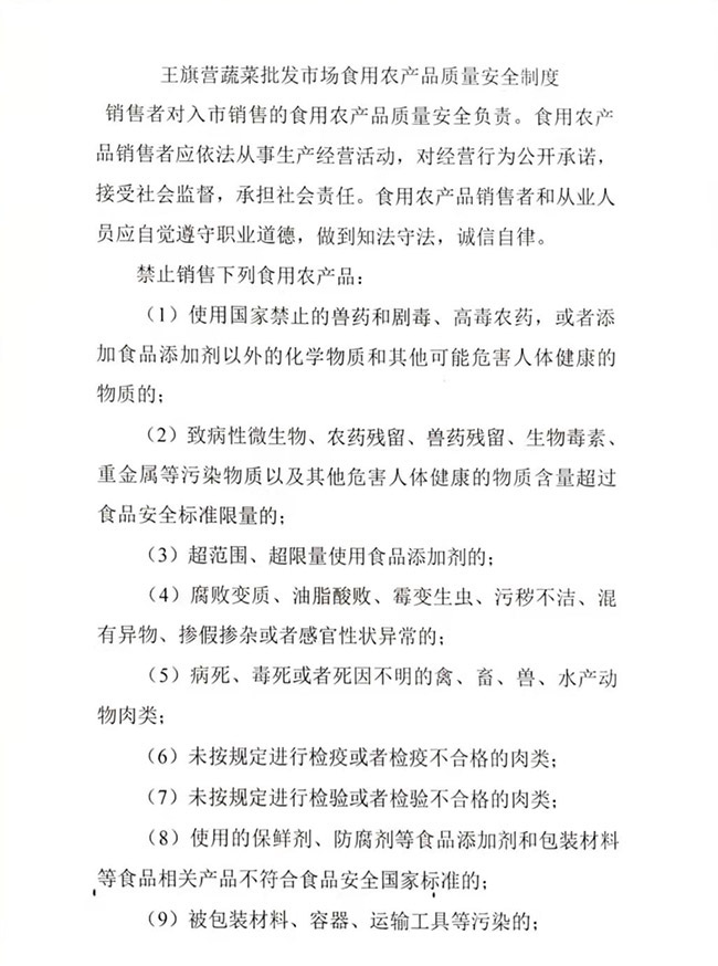 • 王旗營(yíng)蔬菜批發(fā)市場(chǎng)食用農(nóng)產(chǎn)品質(zhì)量安全制度