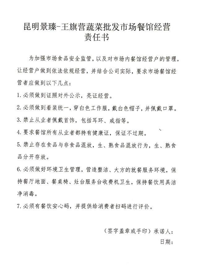 • 昆明景臻·王旗營蔬菜批發(fā)市場餐館經(jīng)營責任書