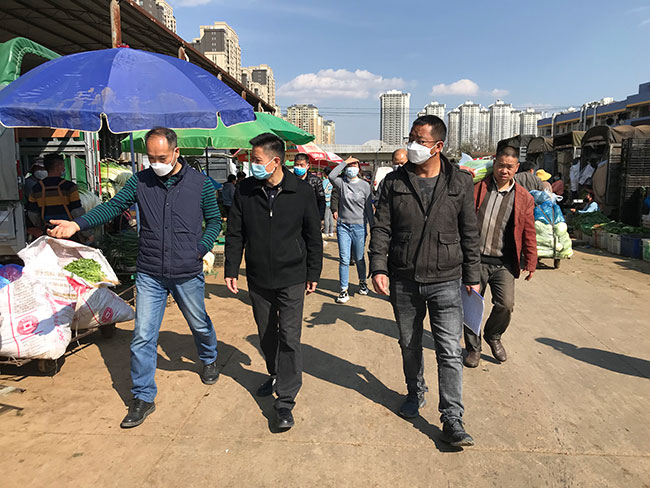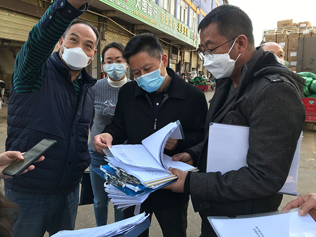 2月25日市督查組來我市場視察防疫工作,總經(jīng)理馬復(fù)坤(右一)一路陪同市督查組來我市場視察防疫工作,圖為正在檢查熱成像測溫攝像槍機(jī)專用通道市督查組來我市場視察防疫工作,圖為正在查看防疫措施登記資料
