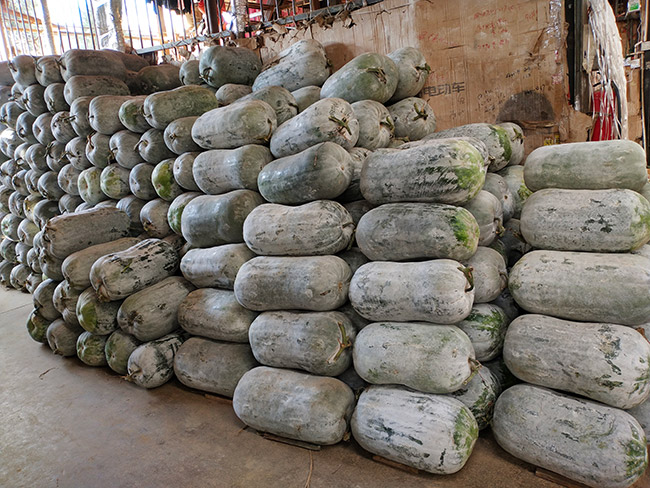 小編發(fā)現(xiàn),在蔬菜批發(fā)市場入口不遠處,一排排“溫室”格外顯眼,“溫室”原來是用來給蔬菜保鮮的大棚。在一處冬瓜大棚內(nèi),一個個一米多長的冬瓜整齊地擺放,幾位工人正從一輛大貨車上將冬瓜搬到大棚內(nèi)。