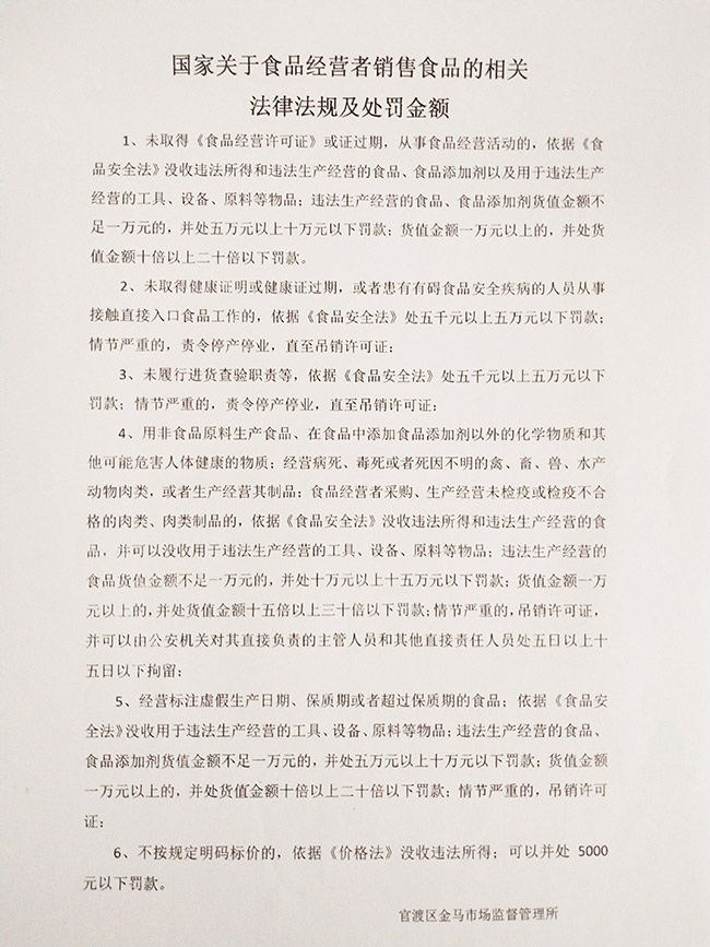 5月17日下午官渡區(qū)市場監(jiān)管局金馬所、官渡區(qū)金馬街道辦事處十里鋪社區(qū)相關領導蒞臨市場對豬肉、牛肉、雞肉、魚肉、超市、水發(fā)菜經(jīng)營戶代表召開了食品安全法律法規(guī)專項會議,會議上市場監(jiān)管局領導對食品經(jīng)營者銷售食品的相關法律法規(guī)及處罰金額做了明確的說明,對未取得《食品經(jīng)營許可證》或證過期,從事食品經(jīng)營活動的;未取得健康證明或健康證過期的;未履行進貨查驗職責的;用非食品原料生產食品、在食品中添加食品添加劑以外的化學物質和其他可能危害人體健康的物質,經(jīng)營病死、毒死或者死因不明的禽、畜、獸、水產動物肉類的;經(jīng)營標注虛假生產日期、保質期或者超過保質期食品的;不按規(guī)定明碼標價的;提出了明確的處罰標準。