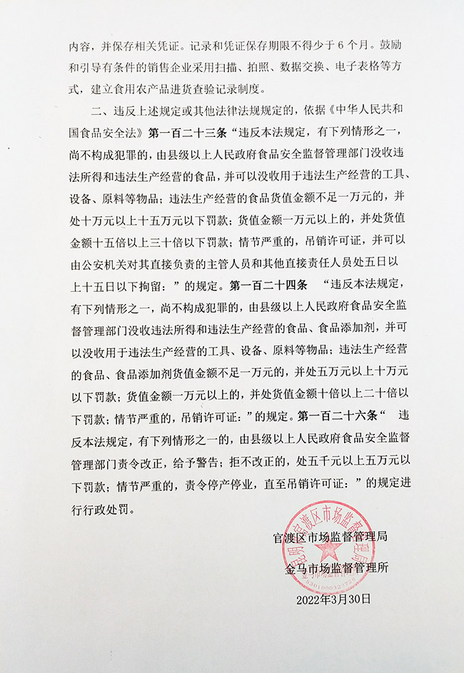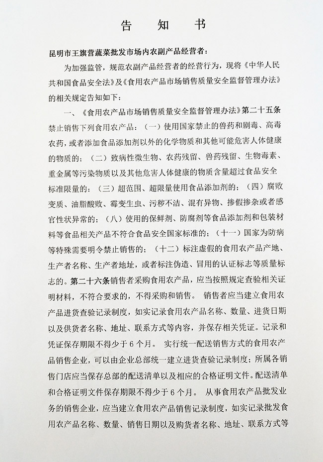 為加強(qiáng)監(jiān)管,規(guī)范農(nóng)副產(chǎn)品經(jīng)營者的經(jīng)營行為,3月30日下午官渡區(qū)市場監(jiān)管局金馬監(jiān)管所、官渡區(qū)金馬街道辦事處十里鋪社區(qū)相關(guān)領(lǐng)導(dǎo)蒞臨市場對水發(fā)菜、山藥、蓮藕、折耳根等45家經(jīng)營戶代表召開了依法依規(guī)誠信經(jīng)營暨農(nóng)產(chǎn)品安全告知會,會議上市場監(jiān)管局相關(guān)領(lǐng)導(dǎo)依據(jù)農(nóng)產(chǎn)品質(zhì)量安全法的相關(guān)規(guī)定,深入淺出、舉一反三作了詳細(xì)解讀,市場相關(guān)負(fù)責(zé)人結(jié)合農(nóng)產(chǎn)品質(zhì)量安全法和市場相關(guān)管理規(guī)定,講解了誠信經(jīng)營的重要性,并作出了相關(guān)要求。會議上對各經(jīng)營戶代表發(fā)放了食品安全《告知書》。