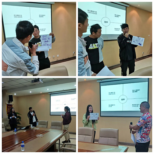 為了讓各部門的新員工相互認識了解,同時營造一個輕松愉快的培訓(xùn)氛圍,我們首先帶大家進行了叫做“搭訕高手”的破冰小游戲,用四宮格畫畫的方式介紹自己,然后一對一猜出對方個人信息。千奇百怪的繪畫在引得大家陣陣笑語的同時也讓大家增進了解、成為朋友。