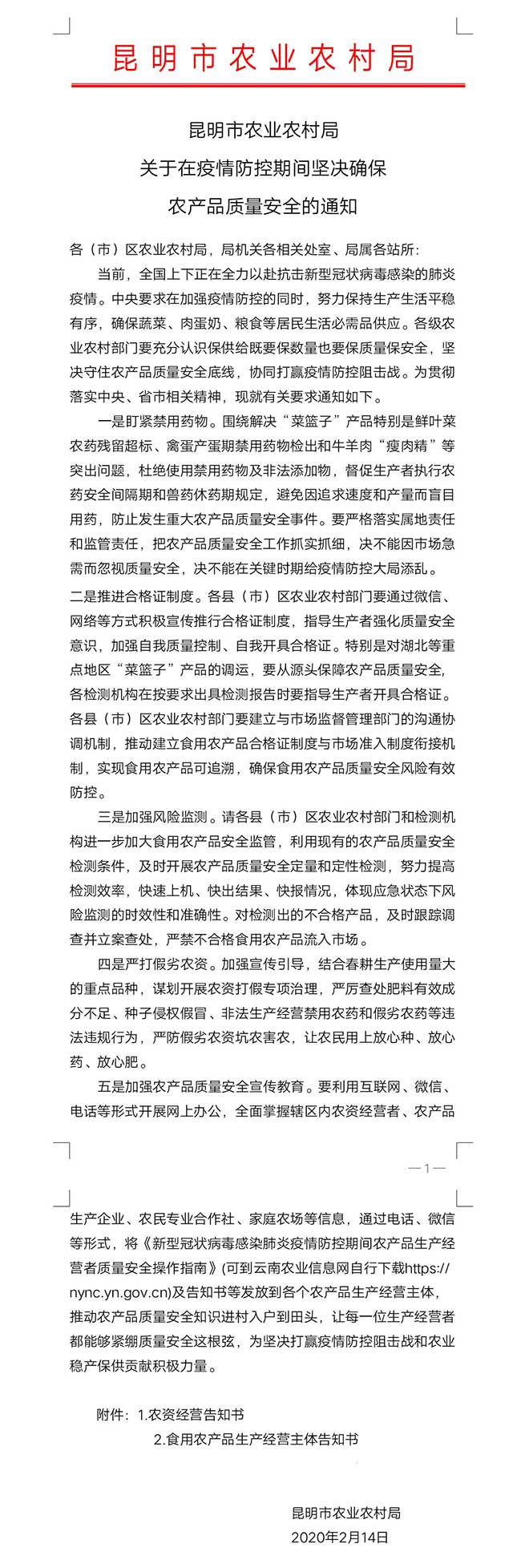 • 【食品安全】昆明市農(nóng)業(yè)農(nóng)村局關(guān)于在疫情防控期間堅決確保農(nóng)產(chǎn)品質(zhì)量安全的通知