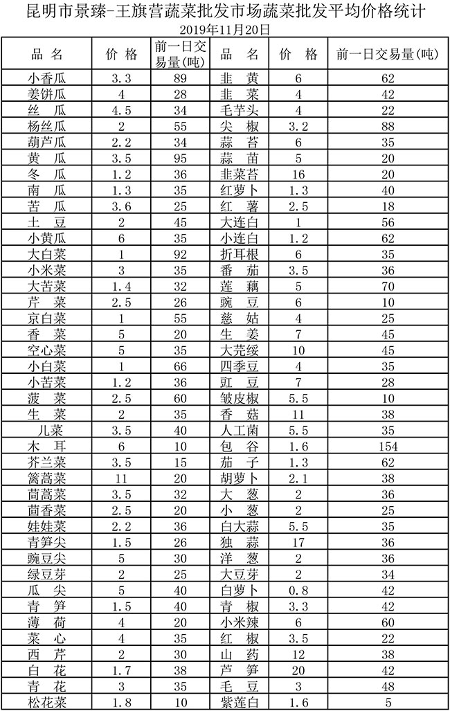 • 昆明景臻·王旗營蔬菜批發(fā)市場平均價格統(tǒng)計2019年11月20日