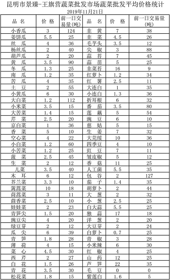 • 昆明景臻·王旗營蔬菜批發(fā)市場平均價格統(tǒng)計2019年11月21日