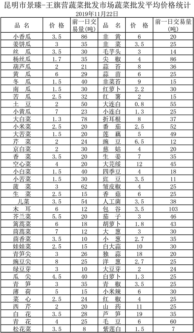 • 昆明景臻·王旗營(yíng)蔬菜批發(fā)市場(chǎng)平均價(jià)格統(tǒng)計(jì)2019年11月22日
