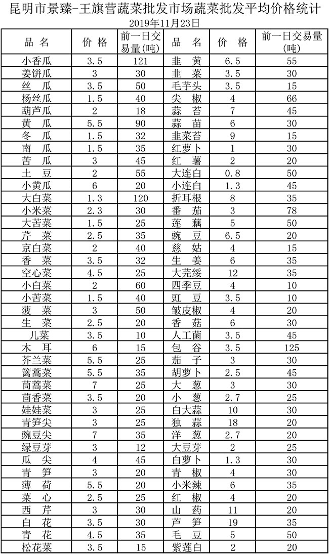 • 昆明景臻·王旗營蔬菜批發(fā)市場平均價格統(tǒng)計2019年11月23日