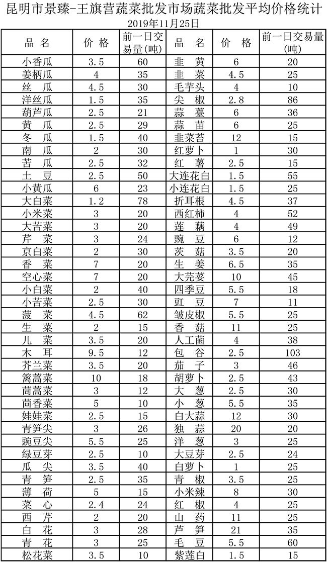 • 昆明景臻·王旗營蔬菜批發(fā)市場平均價格統計2019年11月25日