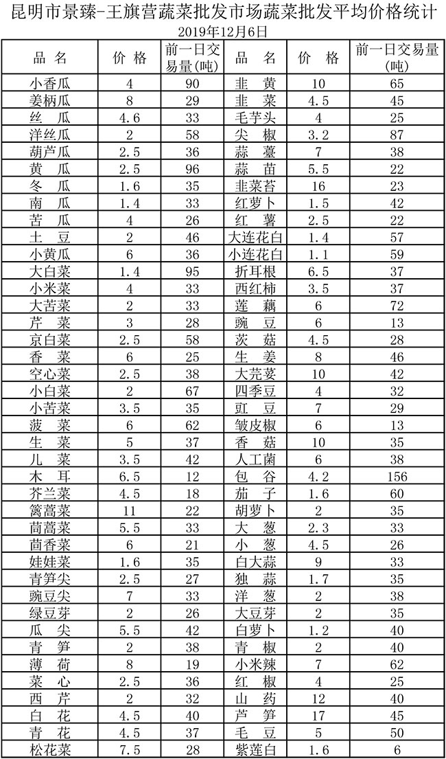 • 昆明景臻·王旗營蔬菜批發(fā)市場平均價格統(tǒng)計2019年12月6日