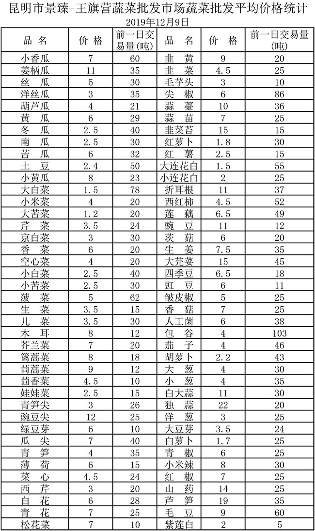 • 昆明景臻·王旗營(yíng)蔬菜批發(fā)市場(chǎng)平均價(jià)格統(tǒng)計(jì)2019年12月9日