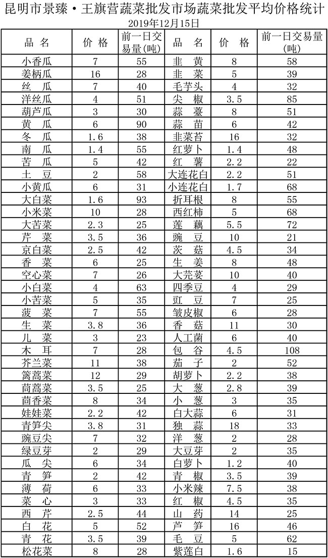 • 昆明景臻·王旗營(yíng)蔬菜批發(fā)市場(chǎng)平均價(jià)格統(tǒng)計(jì)2019年12月15日