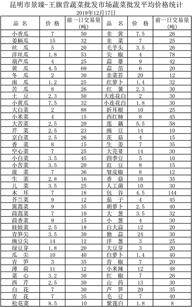 • 昆明景臻·王旗營蔬菜批發(fā)市場平均價格統(tǒng)計2019年12月17日