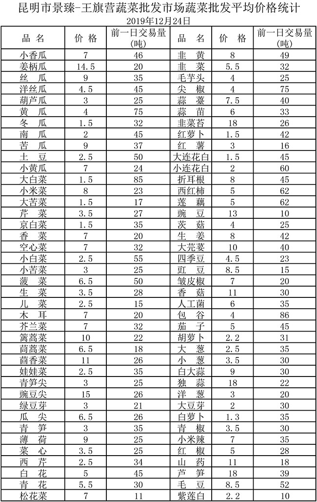 • 昆明景臻·王旗營(yíng)蔬菜批發(fā)市場(chǎng)平均價(jià)格統(tǒng)計(jì)2019年12月24日