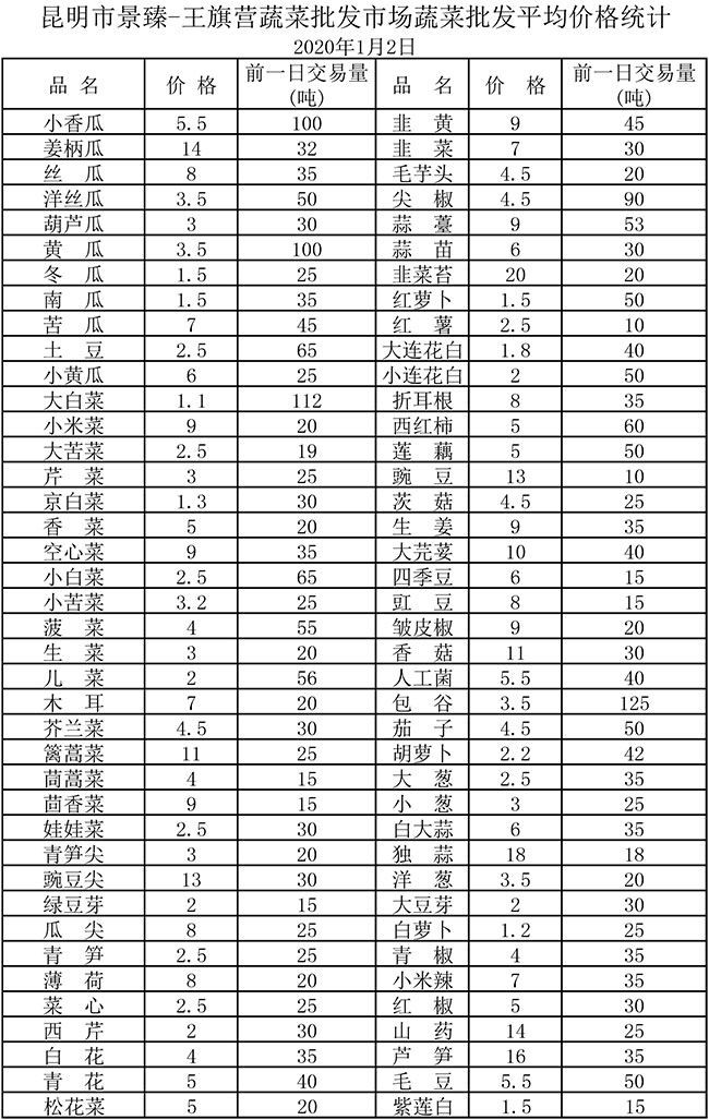 • 昆明景臻·王旗營蔬菜批發(fā)市場平均價格統(tǒng)計2020年1月2日