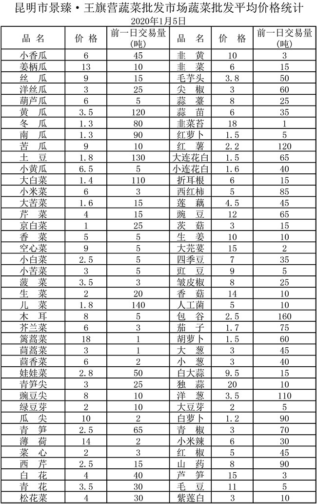 • 昆明景臻·王旗營蔬菜批發(fā)市場(chǎng)平均價(jià)格統(tǒng)計(jì)2020年1月5日
