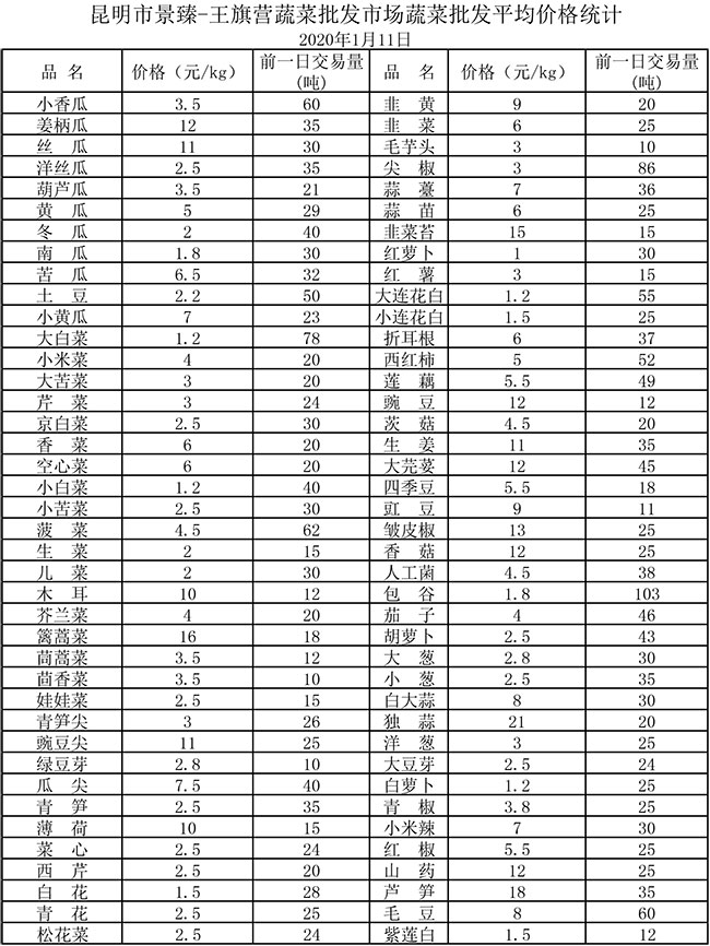 • 昆明景臻·王旗營(yíng)蔬菜批發(fā)市場(chǎng)平均價(jià)格統(tǒng)計(jì)2020年1月11日
