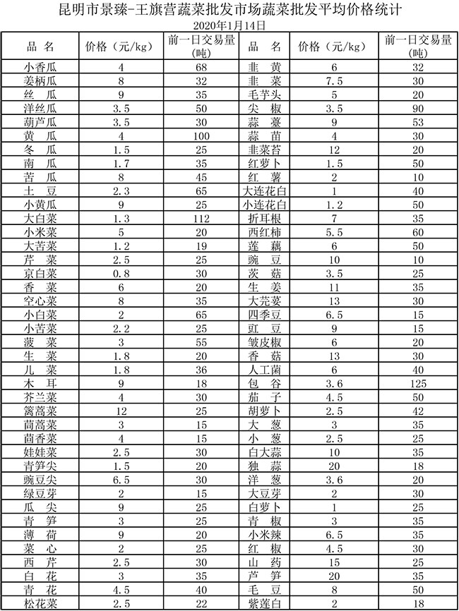 • 昆明景臻·王旗營蔬菜批發(fā)市場平均價格統(tǒng)計2020年1月14日