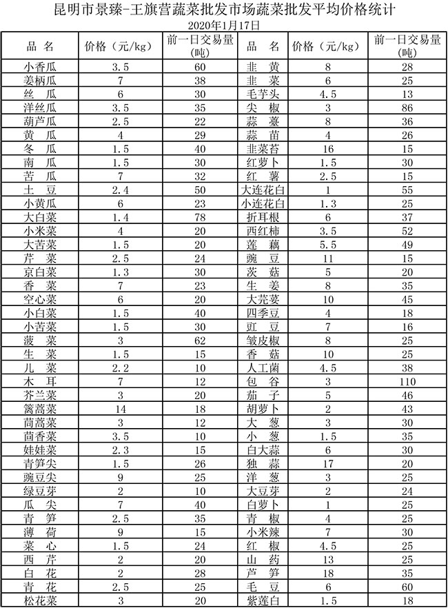 • 昆明景臻·王旗營蔬菜批發(fā)市場平均價(jià)格統(tǒng)計(jì)2020年1月17日