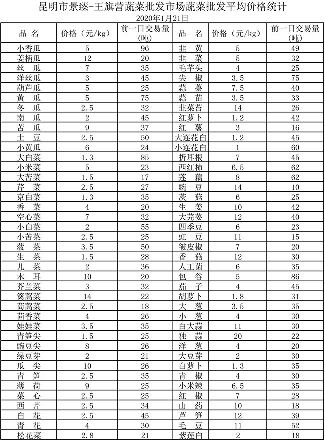 • 昆明景臻·王旗營蔬菜批發(fā)市場平均價格統(tǒng)計2020年1月21日