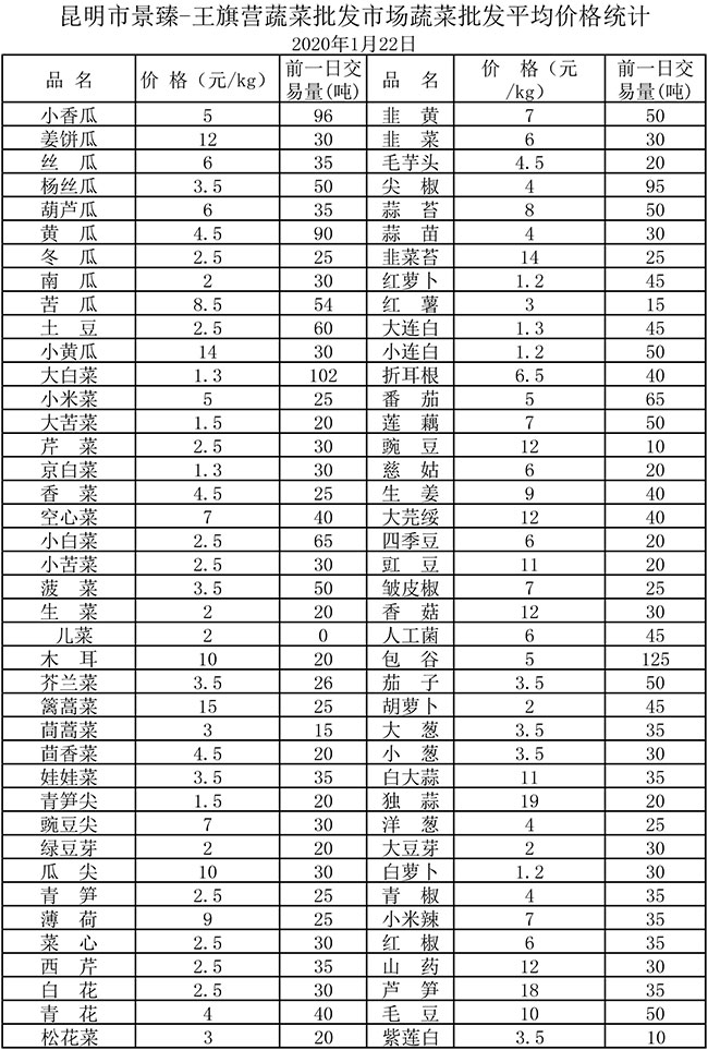 • 昆明景臻·王旗營蔬菜批發(fā)市場平均價格統(tǒng)計2020年1月22日