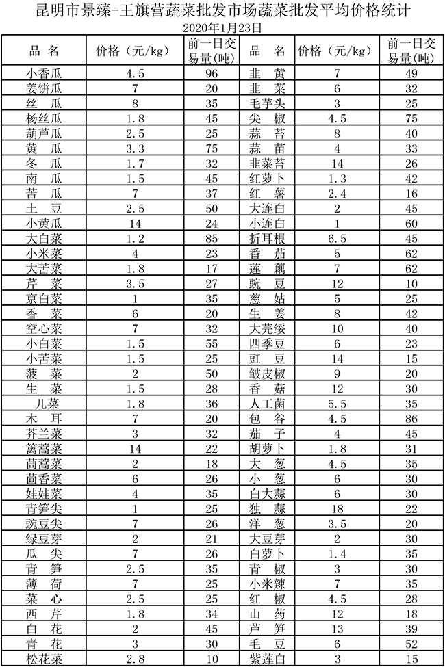 • 昆明景臻·王旗營(yíng)蔬菜批發(fā)市場(chǎng)平均價(jià)格統(tǒng)計(jì)2020年1月23日