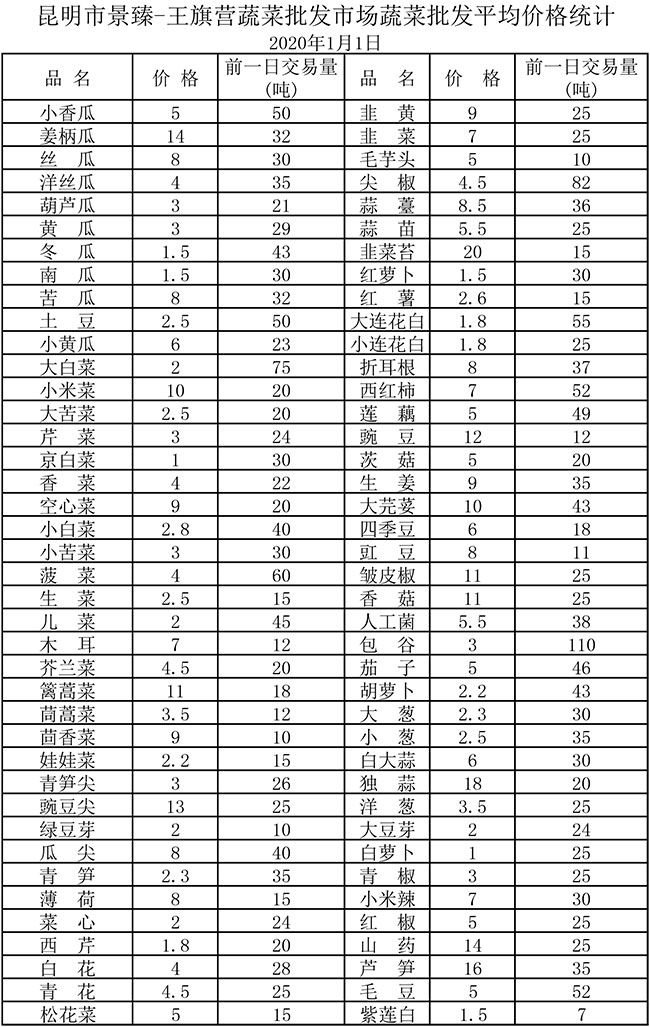 • 昆明景臻·王旗營(yíng)蔬菜批發(fā)市場(chǎng)平均價(jià)格統(tǒng)計(jì)2020年1月1日