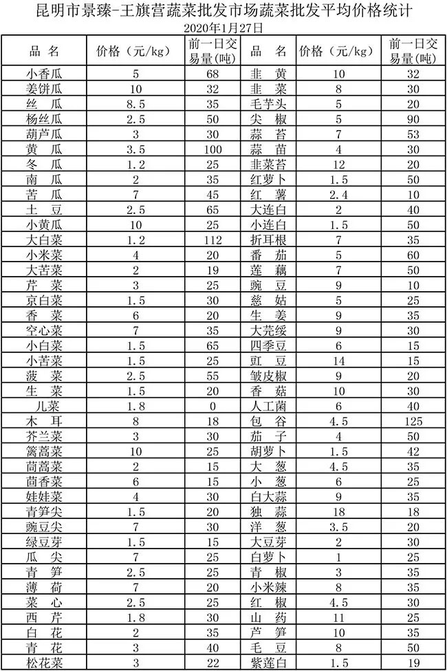 • 昆明景臻·王旗營(yíng)蔬菜批發(fā)市場(chǎng)平均價(jià)格統(tǒng)計(jì)2020年1月27日