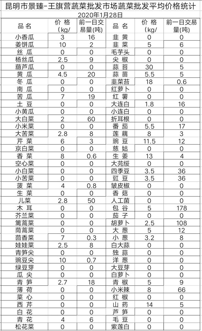 • 昆明景臻·王旗營蔬菜批發(fā)市場平均價格統(tǒng)計2020年1月28日