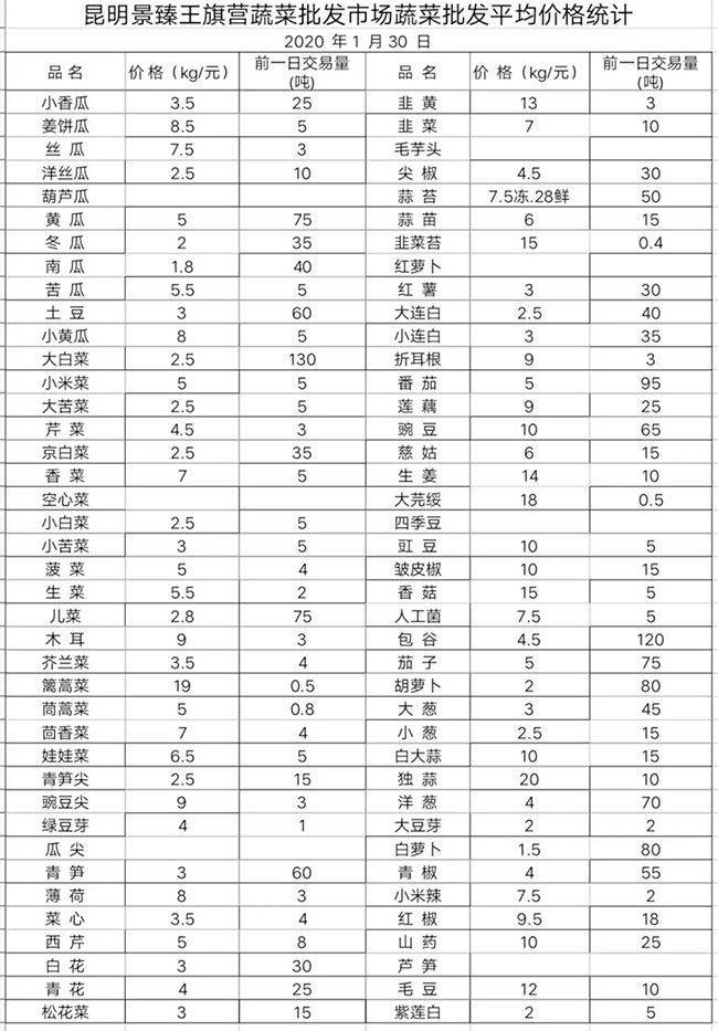 • 昆明景臻·王旗營蔬菜批發(fā)市場平均價(jià)格統(tǒng)計(jì)2020年1月30日