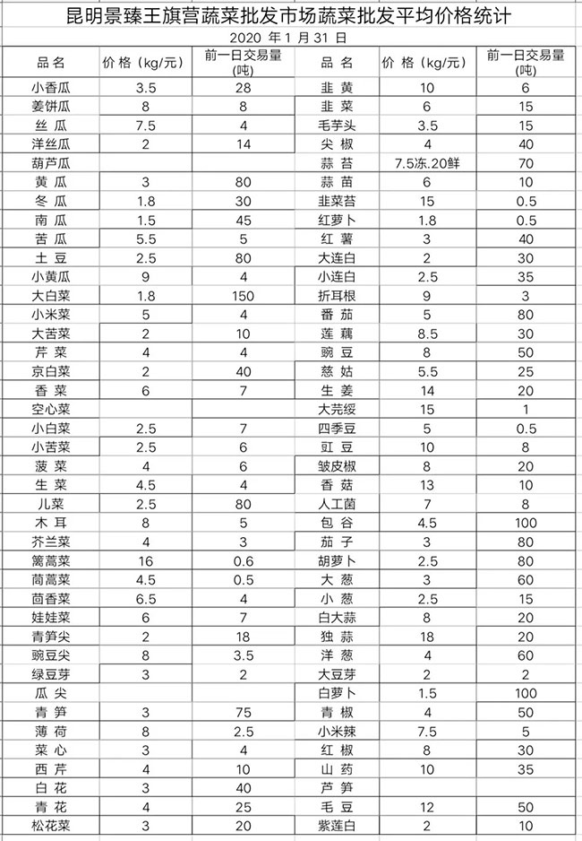 • 昆明景臻·王旗營(yíng)蔬菜批發(fā)市場(chǎng)平均價(jià)格統(tǒng)計(jì)2020年1月31日