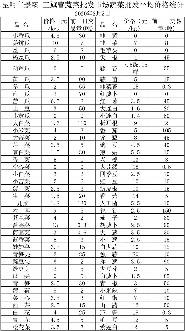 • 昆明景臻·王旗營蔬菜批發(fā)市場平均價格統(tǒng)計2020年2月2日