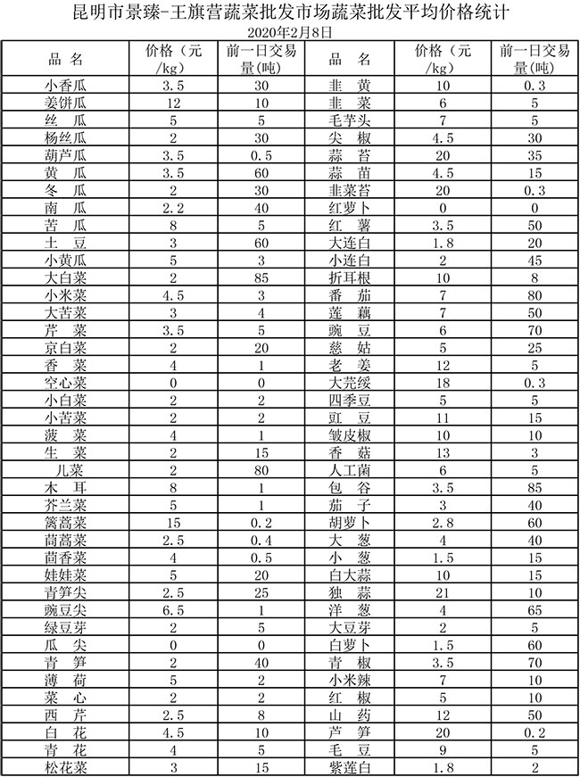 • 昆明景臻·王旗營(yíng)蔬菜批發(fā)市場(chǎng)平均價(jià)格統(tǒng)計(jì)2020年2月8日