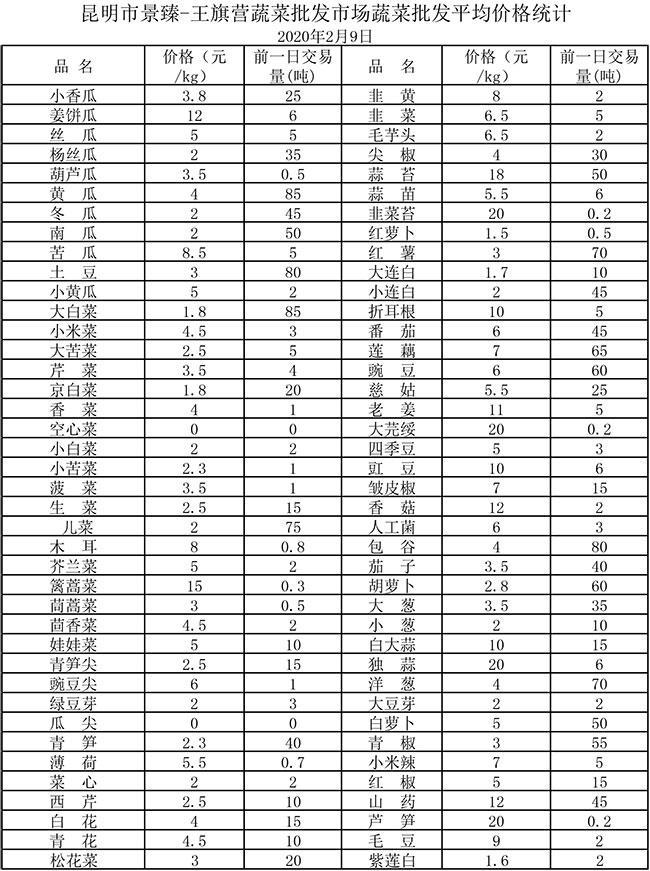 • 昆明景臻·王旗營(yíng)蔬菜批發(fā)市場(chǎng)平均價(jià)格統(tǒng)計(jì)2020年2月9日
