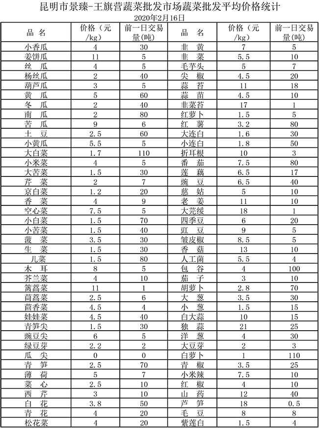 • 昆明景臻·王旗營(yíng)蔬菜批發(fā)市場(chǎng)平均價(jià)格統(tǒng)計(jì)2020年2月16日