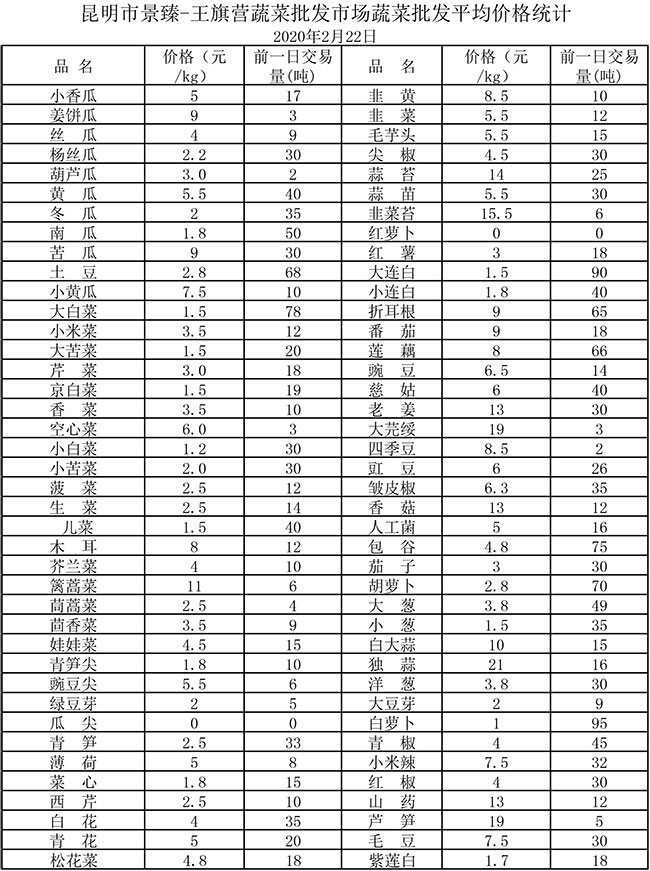• 昆明景臻·王旗營蔬菜批發(fā)市場平均價格統(tǒng)計2020年2月22日