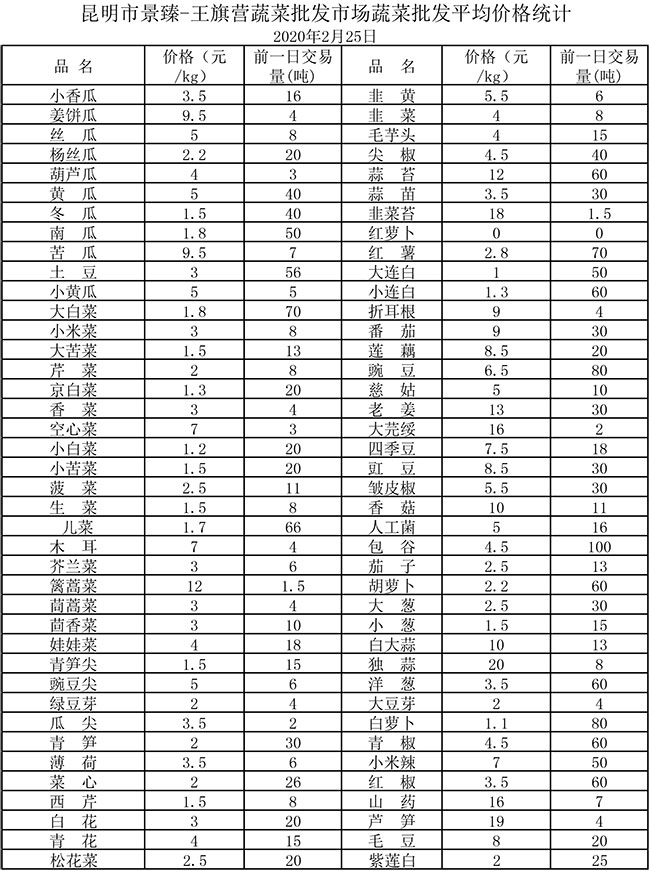 • 昆明景臻·王旗營蔬菜批發(fā)市場平均價格統(tǒng)計2020年2月25日