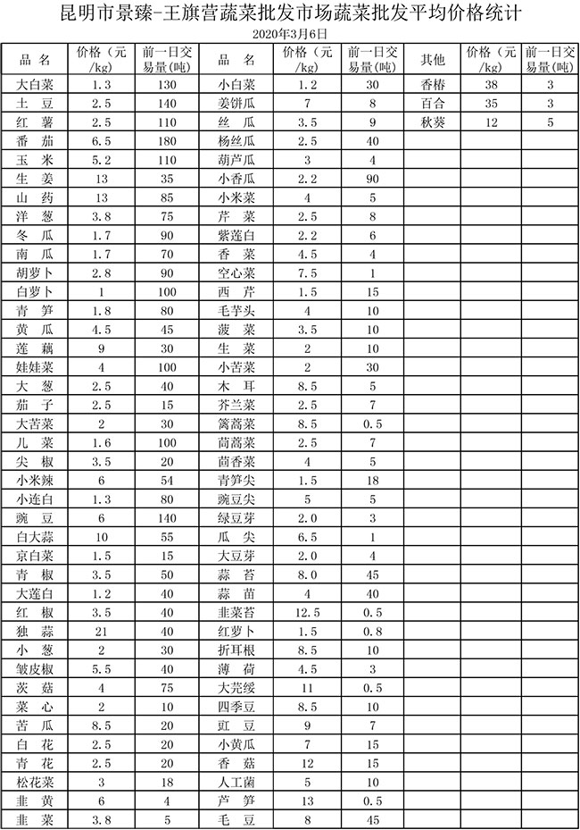 • 市場平均價格統(tǒng)計2020年3月6日