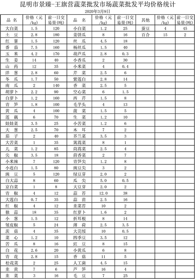 • 市場平均價格統(tǒng)計(jì)2020年3月9日
