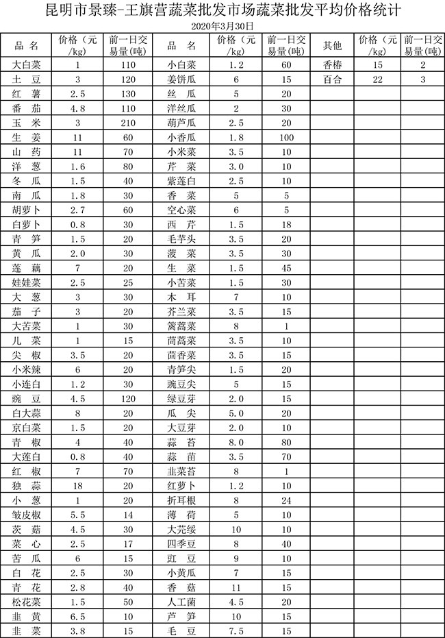 • 市場(chǎng)平均價(jià)格統(tǒng)計(jì)2020年3月30日