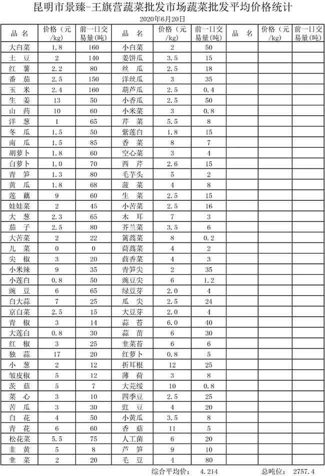 • 市場平均價格統(tǒng)計2020年6月20日