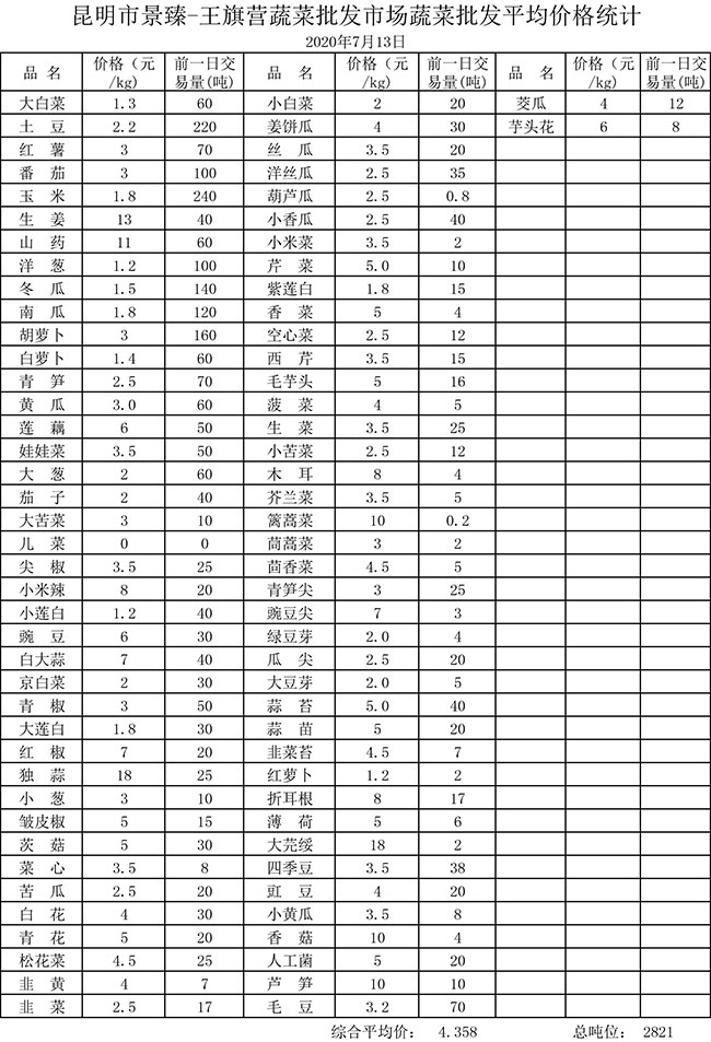 • 市場平均價格統(tǒng)計2020年7月13日