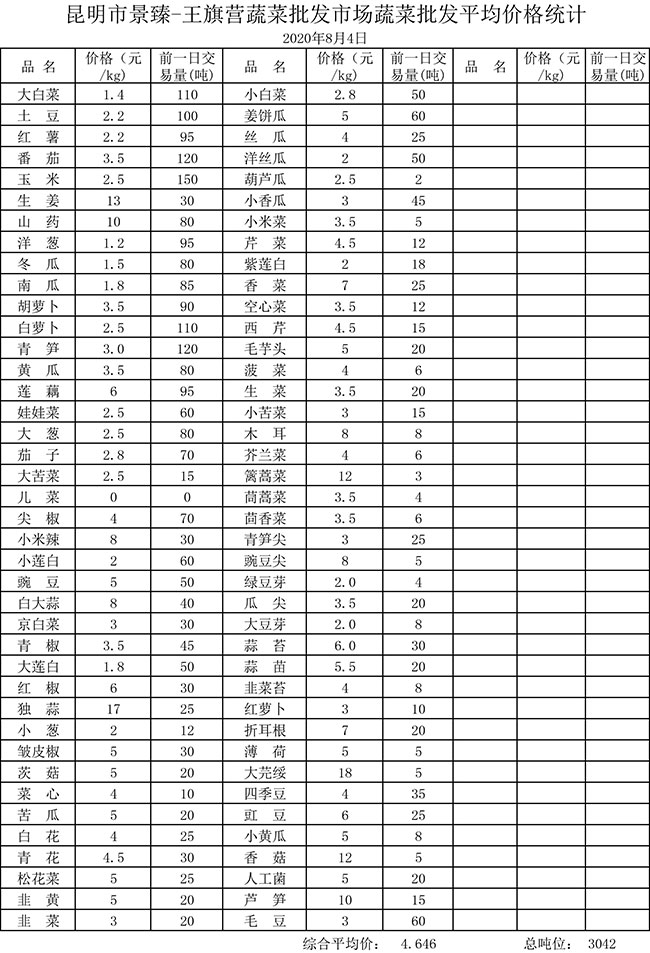 • 市場平均價格統(tǒng)計2020年8月4日
