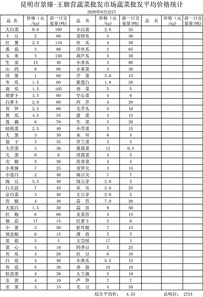 • 市場平均價(jià)格統(tǒng)計(jì)2020年8月22日