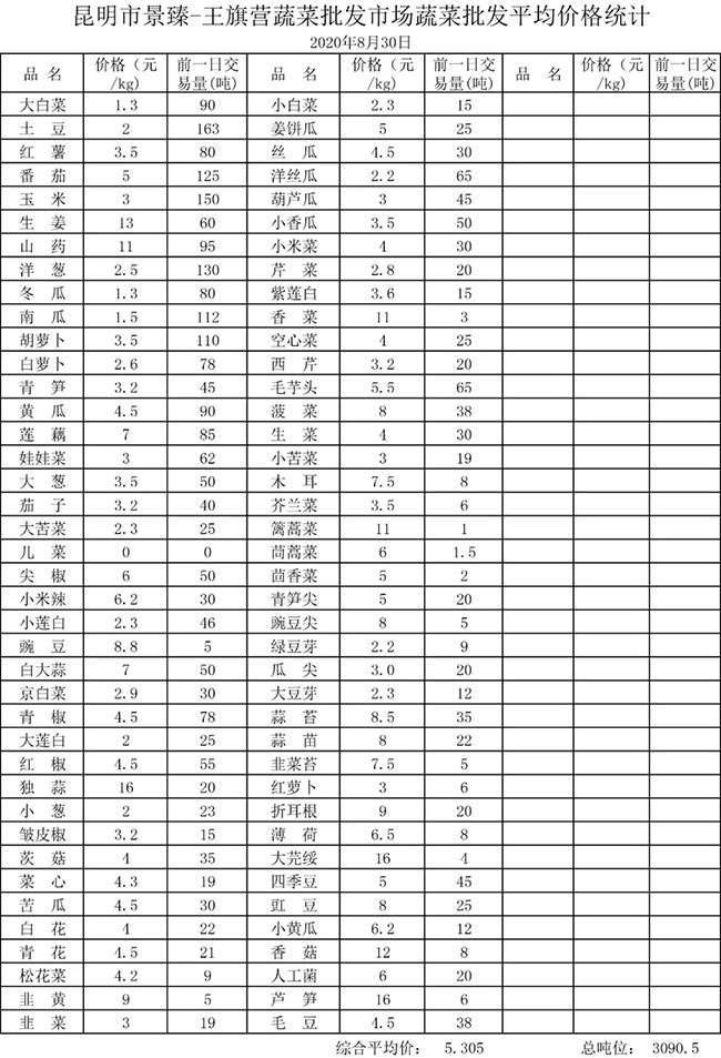 • 市場(chǎng)平均價(jià)格統(tǒng)計(jì)2020年8月30日