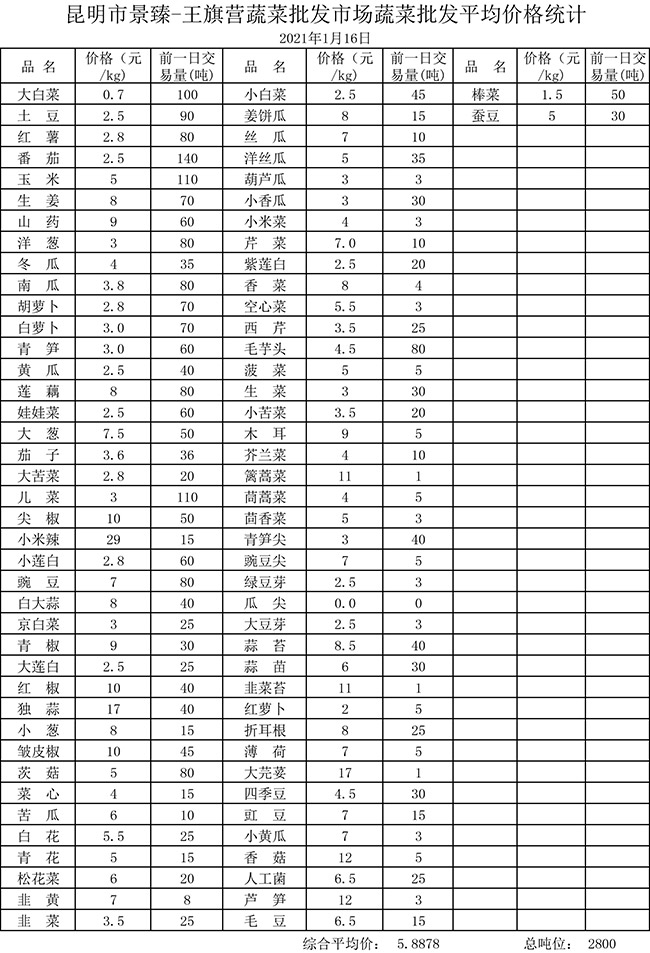 • 市場平均價格統(tǒng)計2021年1月16日