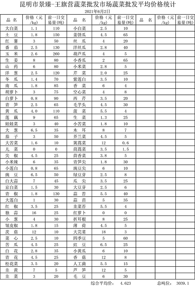 • 市場平均價格統(tǒng)計2021年6月2日
