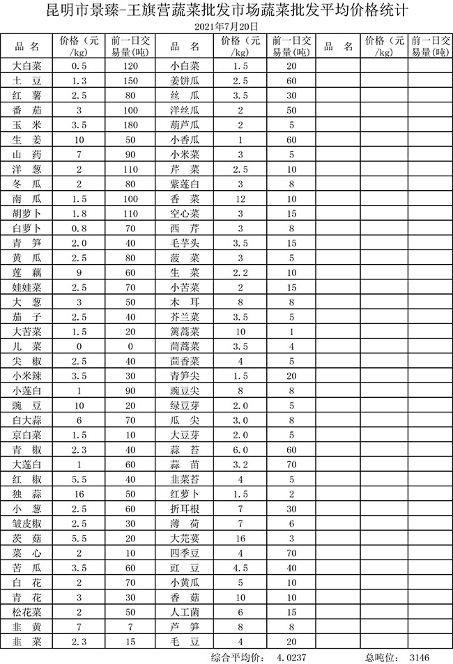 • 市場平均價格統(tǒng)計2021年7月20日