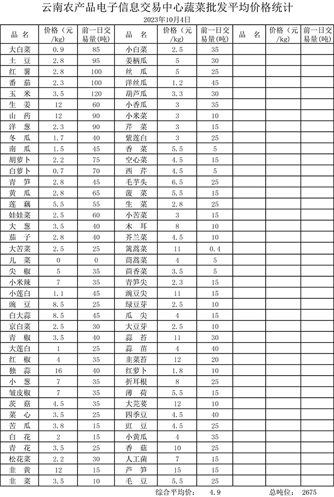 • 市場(chǎng)平均價(jià)格統(tǒng)計(jì)2023年10月4日