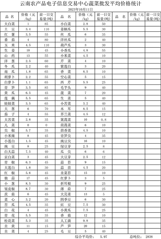 • 市場(chǎng)平均價(jià)格統(tǒng)計(jì)2023年10月11日